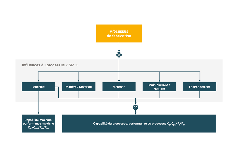La sortie d’un processus détermine s’il s’agit d’un processus de mesure et d’essai ou d’un processus de fabrication. Lorsque la sortie est basée sur des données, telles que des valeurs de mesure ou des évaluations attributives, il s’agit de processus de mesure et d’essai. Lorsque la sortie est une pièce (pièce usinée, produit ou composant), on parle alors de processus de fabrication. Selon qu’il s’agisse d’un processus de mesure et d’essai ou d’un processus de fabrication, différentes méthodes d’assurance qualité sont appliquées.