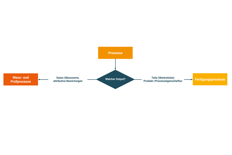 Der Output eines Prozesses bestimmt, ob es sich um einen Mess- und Prüfprozess oder um einen Fertigungsprozess handelt. Ist der Output datenbasiert, wie z.B. Messwerte oder attributive Bewertungen, so liegen Mess- und Prüfprozesse vor. Ist der Output ein Teil (Werkstück, Produkt oder Bauteil) so ist von Fertigungsprozessen zu sprechen. Abhängig ob es sich um einen Mess- und Prüfprozess oder um einen Fertigungsprozess handelt, werden unterschiedliche qualitätssichernde Methoden herangezogen.